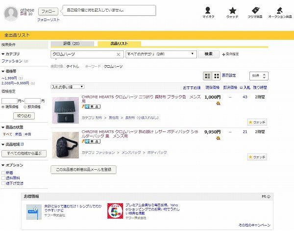 本日は、ヤフーオークションにおけるクロムハーツの偽物を販売する出品者のIDと、